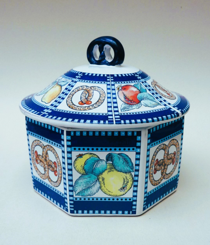 Octagonal faience cookie jar with round lid. The blue and white box is decorated with pretzels and various types of fruit.
