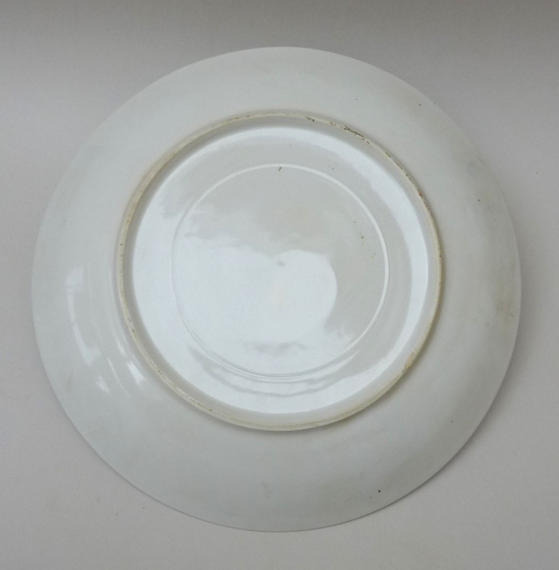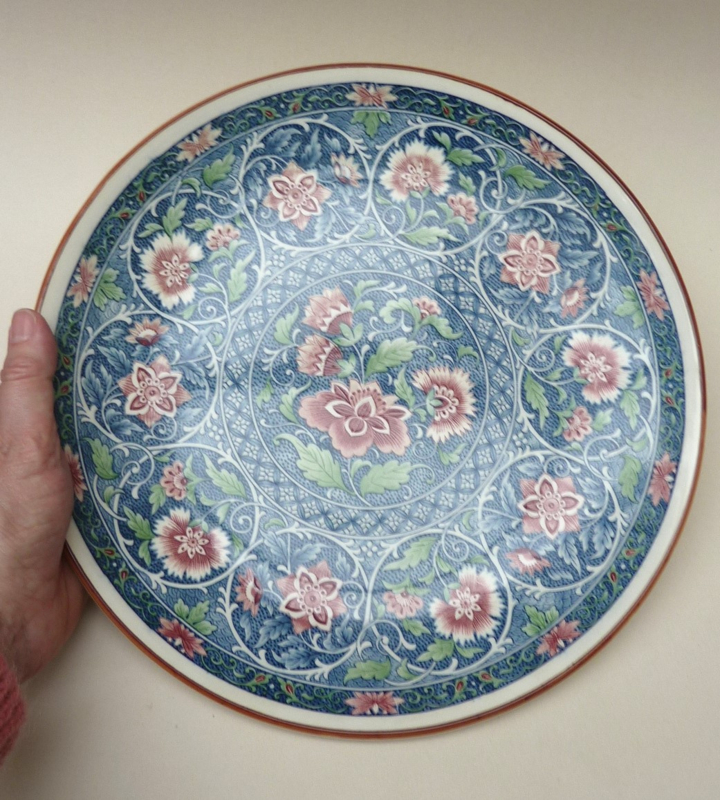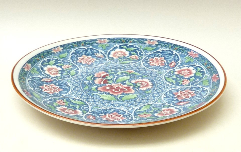 Japanese porcelain bowl decorated with pink flowers against a blue background.