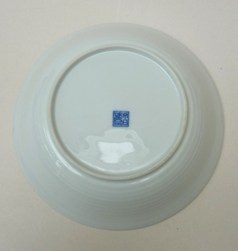 Japanese porcelain bowl, decorated on the inside with a blue and white checked band and blue and white blossoms against a soft yellow background.