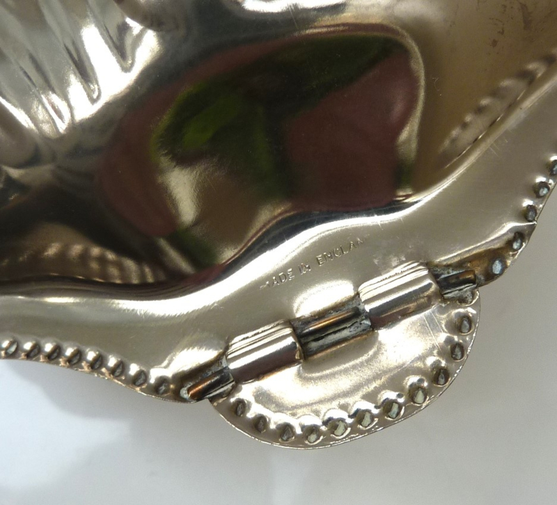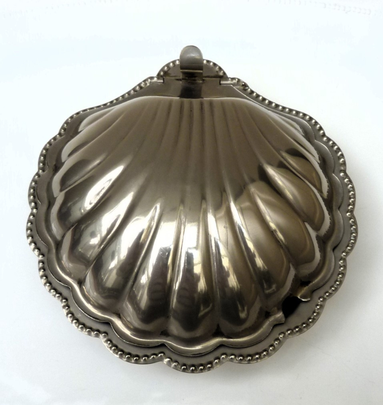 White metal butter shell with lid and pressed glass insert. The lid has a thumb rest and a recess for the butter knife.