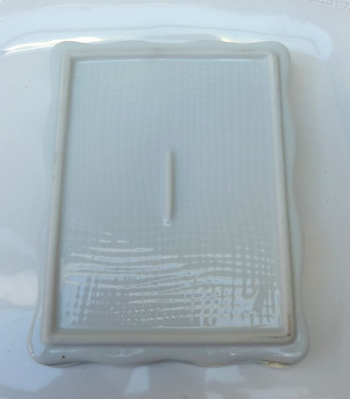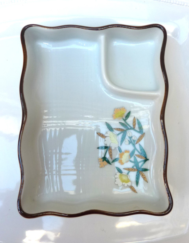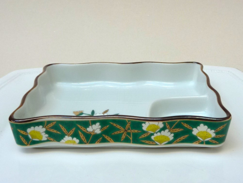 Rectangular porcelain plate for serving sushi, dumplings or rolls. The plate has a recess for soy sauce. Decorated on the raised edge with a band of white flowers with a yellow heart against a green background, gold-coloured details and with a bouquet on the white inside.
